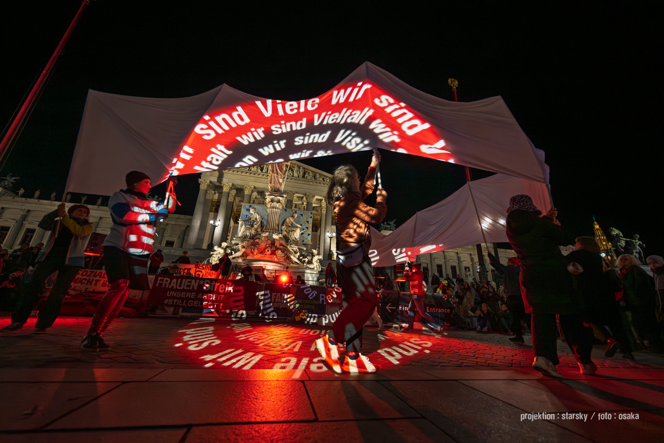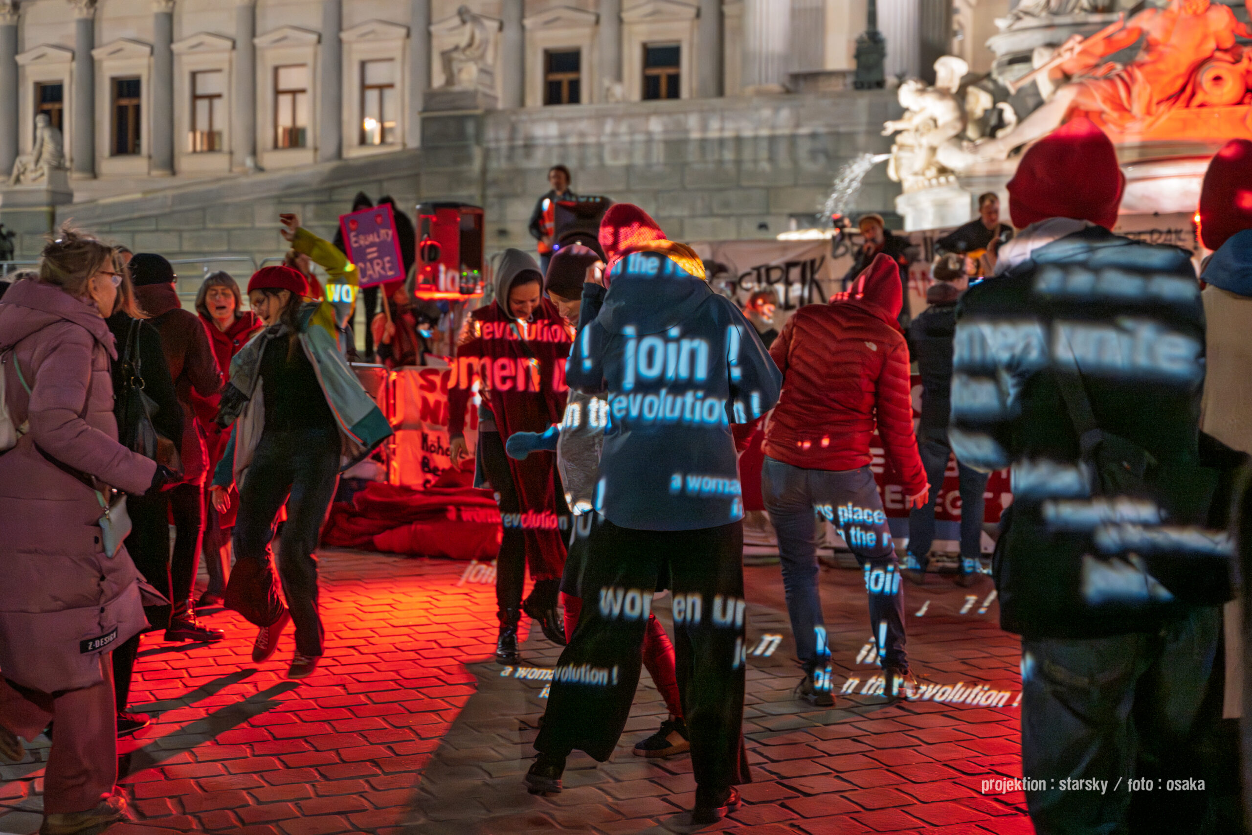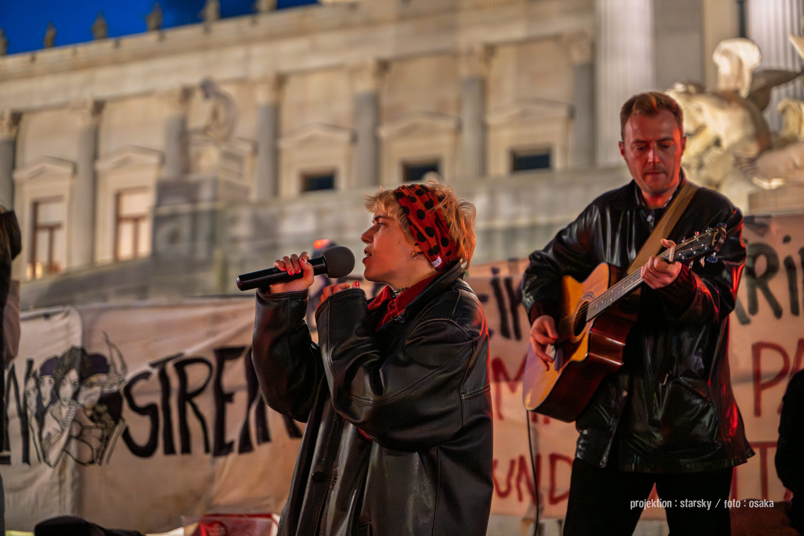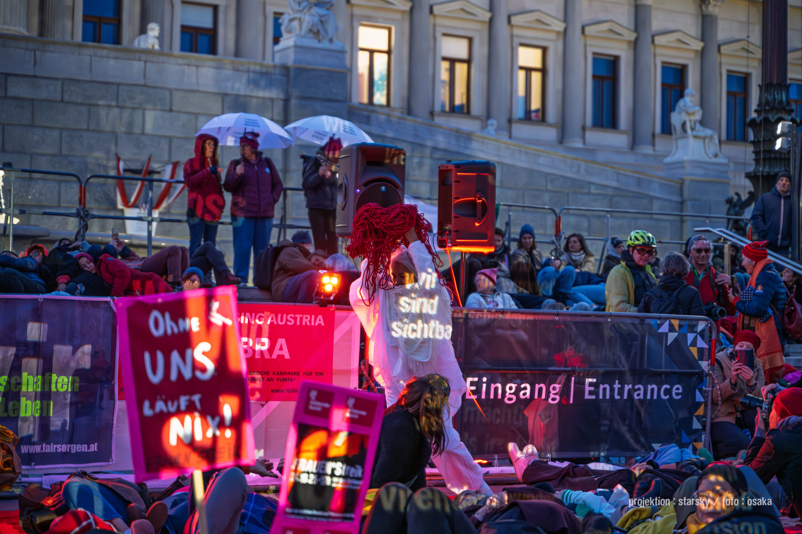 salon emmer gab mit einer Performance der Pionierinnen den Auftakt zu drei gemeinsamen „Stilllegungen“, magischen Momenten des Innehaltens, in denen die gemeinsame Kraft spürbar wurde. Mit im Programm waren mitreißende Songs von ERNST, ein kämpferischer Wordrap von Yasmo und kraftvolle Performances von Aiko Kazuko Kurosaki zu „feminist text interventions“ von starsky – Projektionen, die das Parlament und die Streikenden in zukunftsweisendem Licht erscheinen ließen.