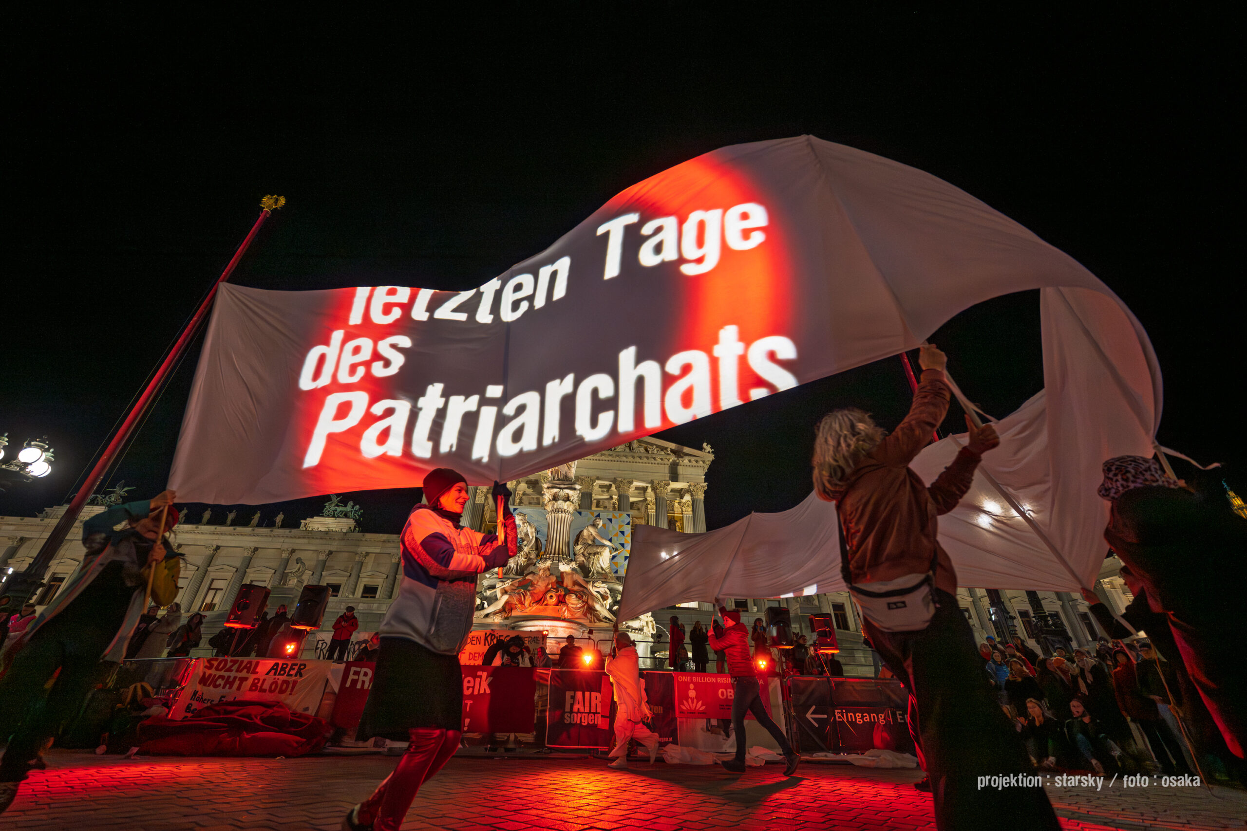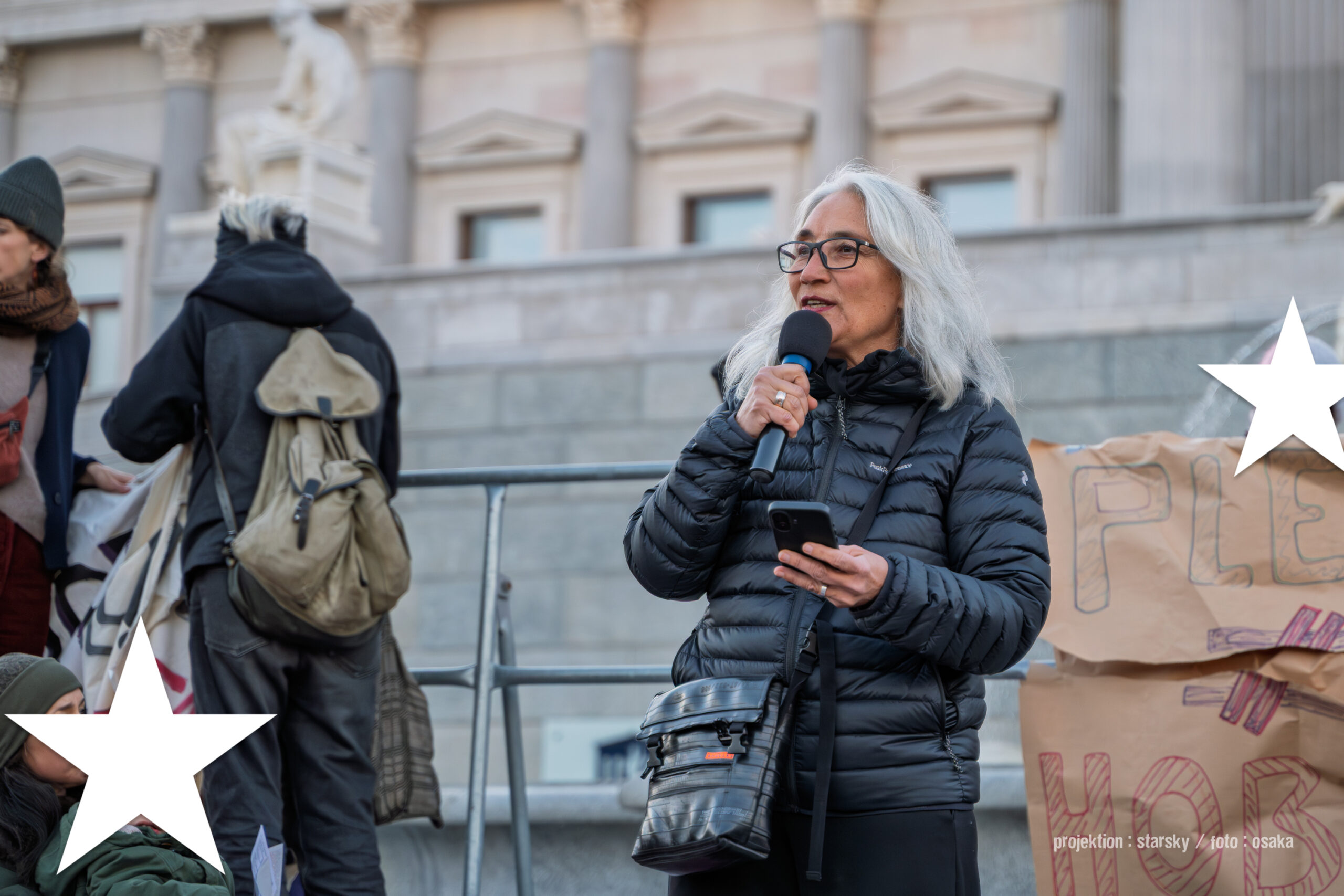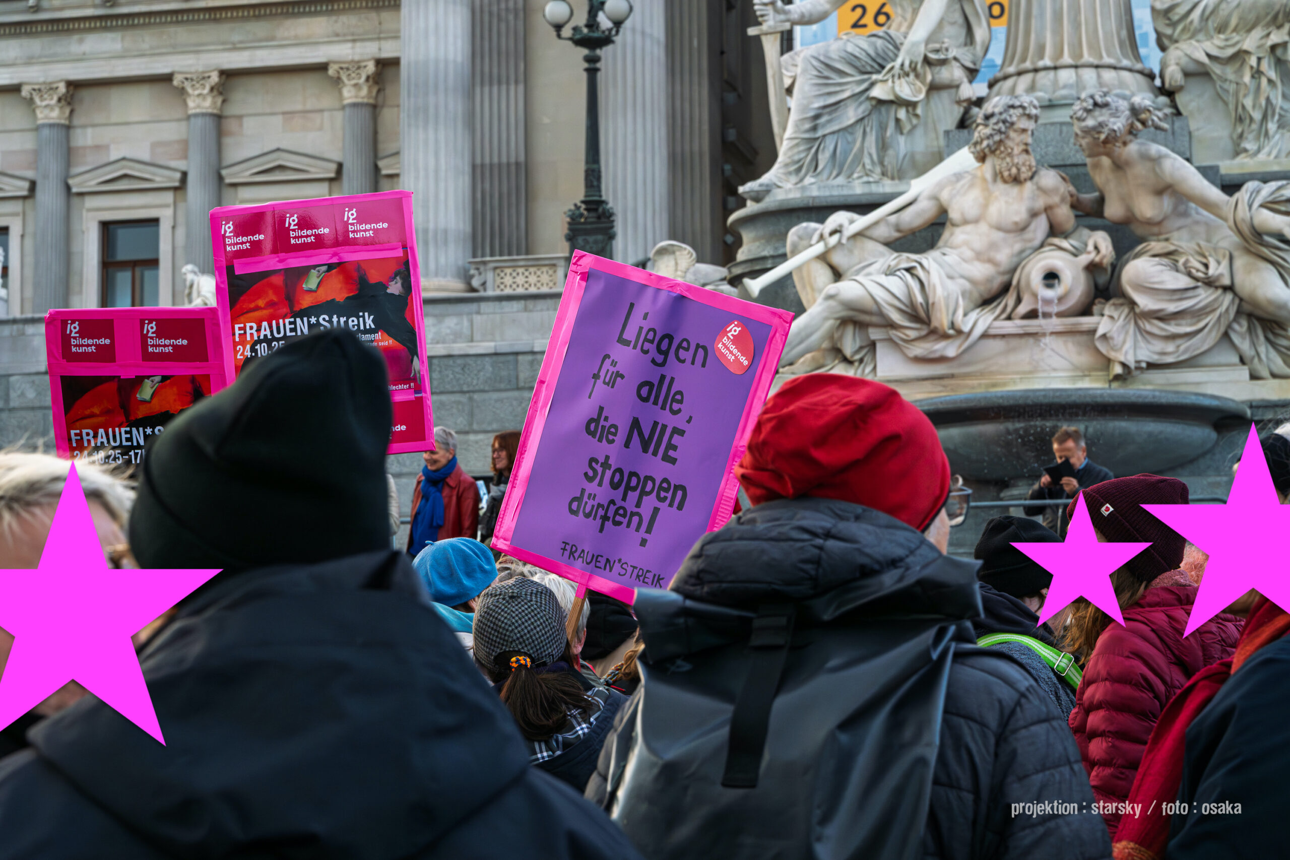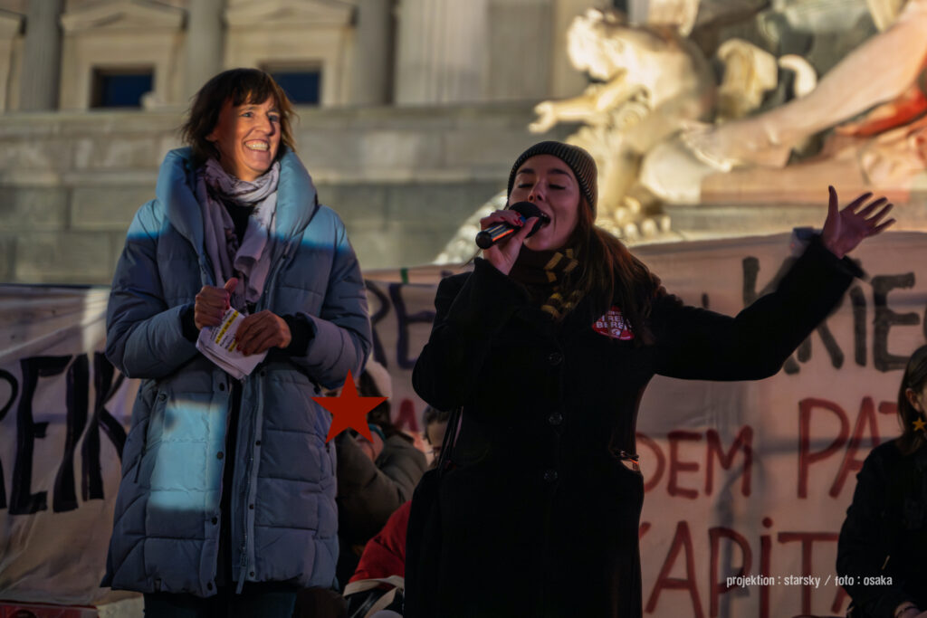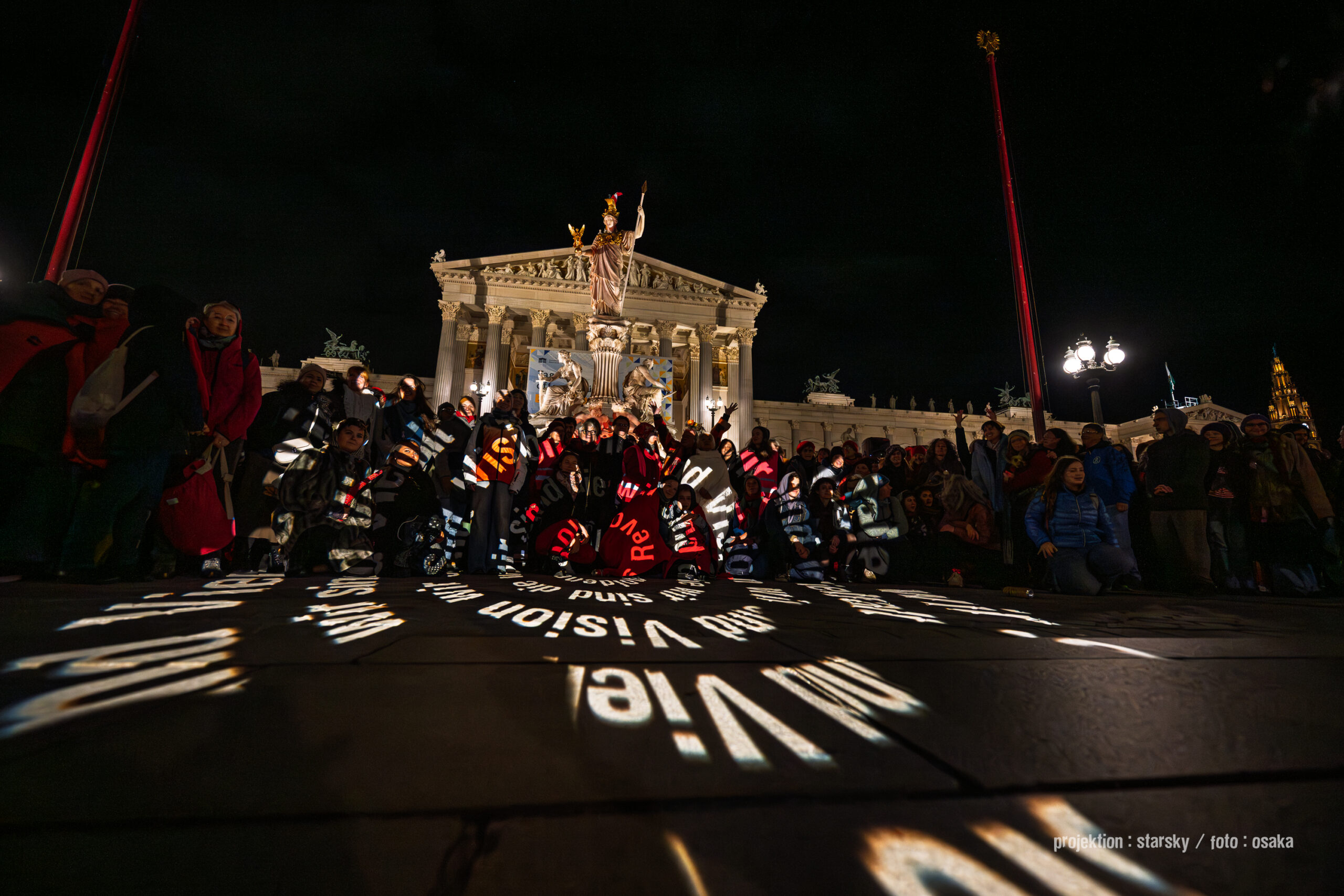 salon emmer gab mit einer Performance der Pionierinnen den Auftakt zu drei gemeinsamen „Stilllegungen“, magischen Momenten des Innehaltens, in denen die gemeinsame Kraft spürbar wurde. Mit im Programm waren mitreißende Songs von ERNST, ein kämpferischer Wordrap von Yasmo und kraftvolle Performances von Aiko Kazuko Kurosaki zu „feminist text interventions“ von starsky – Projektionen, die das Parlament und die Streikenden in zukunftsweisendem Licht erscheinen ließen.