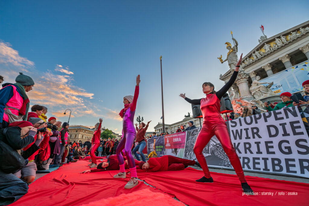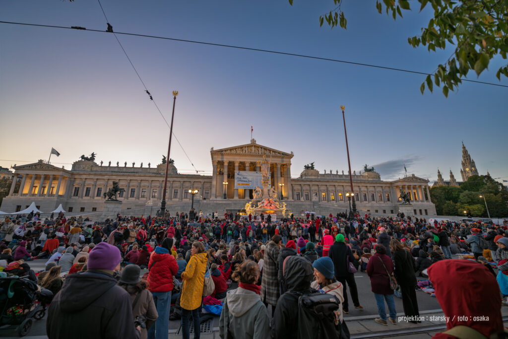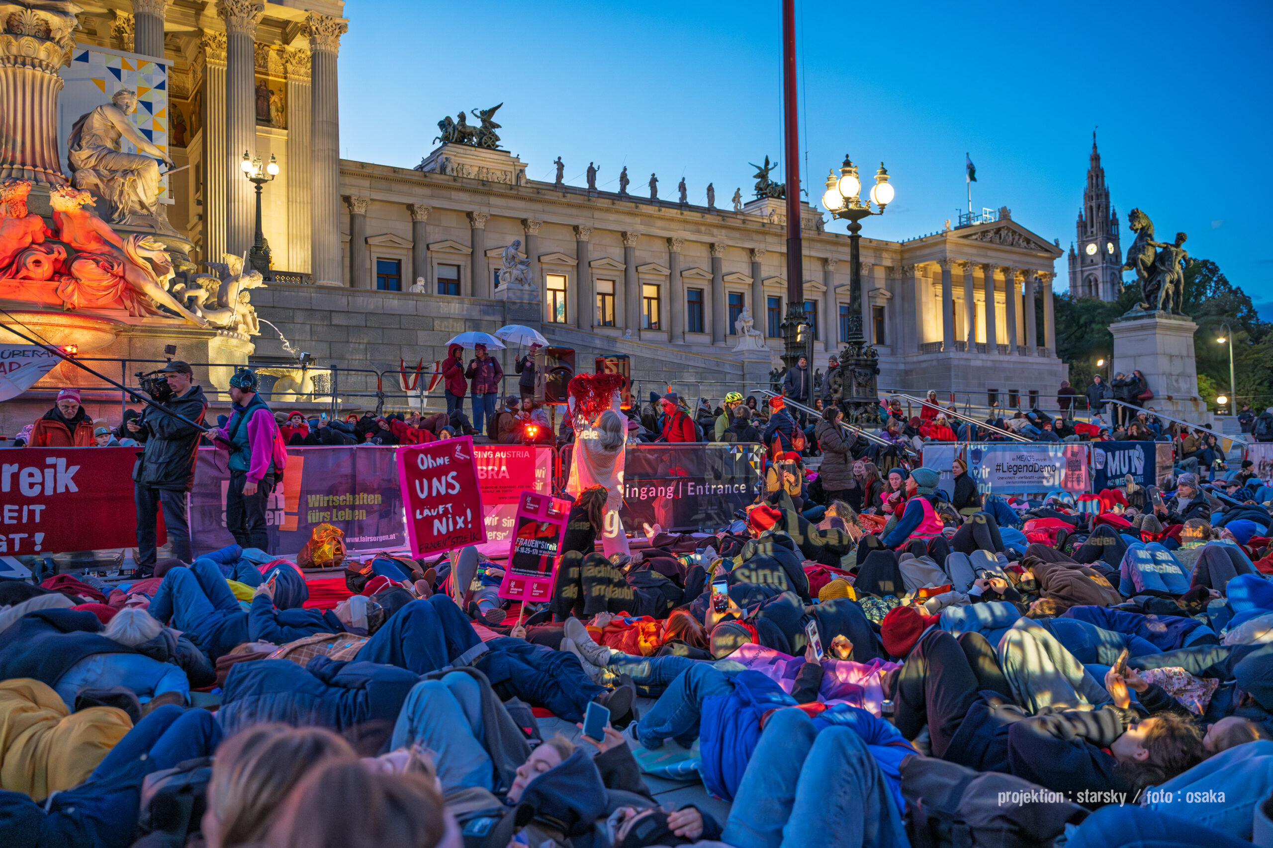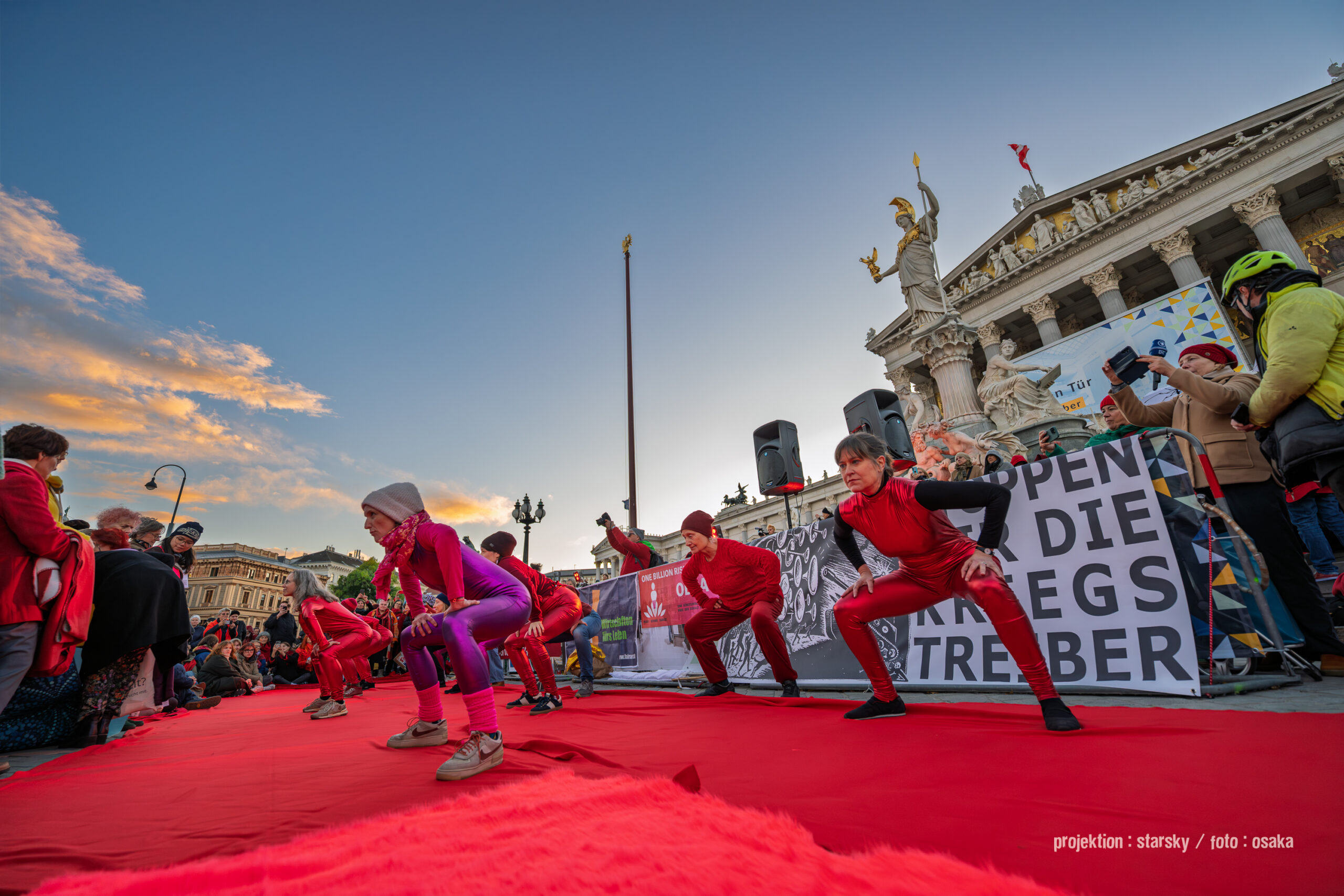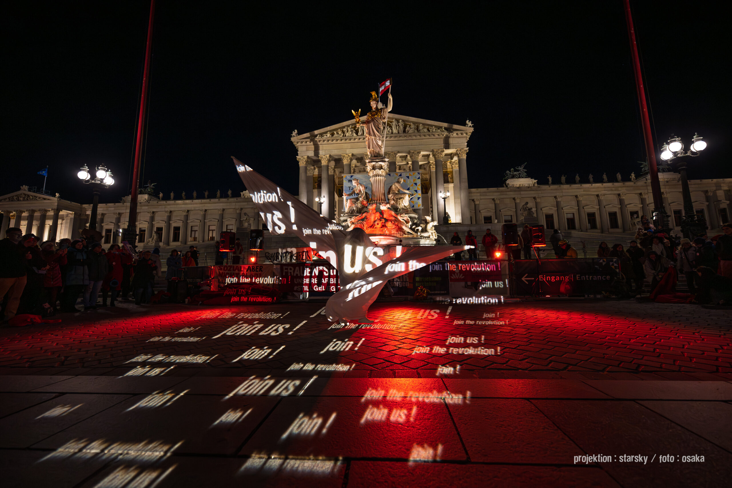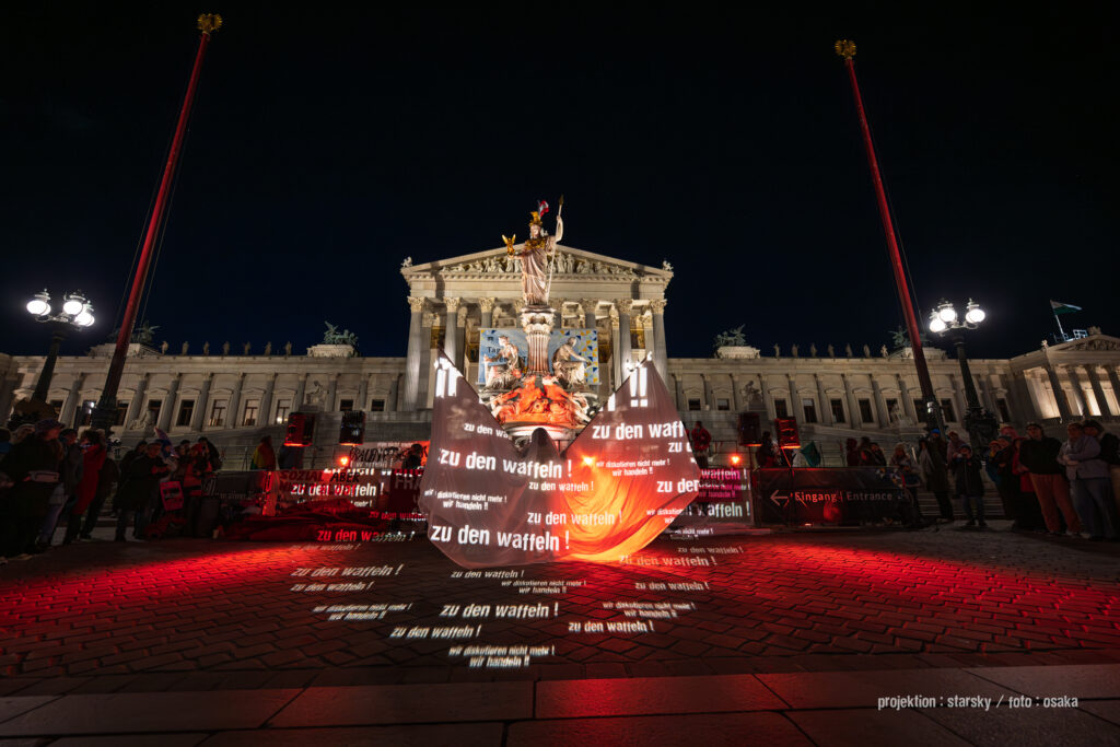 salon emmer gab mit einer Performance der Pionierinnen den Auftakt zu drei gemeinsamen „Stilllegungen“, magischen Momenten des Innehaltens, in denen die gemeinsame Kraft spürbar wurde. Mit im Programm waren mitreißende Songs von ERNST, ein kämpferischer Wordrap von Yasmo und kraftvolle Performances von Aiko Kazuko Kurosaki zu „feminist text interventions“ von starsky – Projektionen, die das Parlament und die Streikenden in zukunftsweisendem Licht erscheinen ließen.
