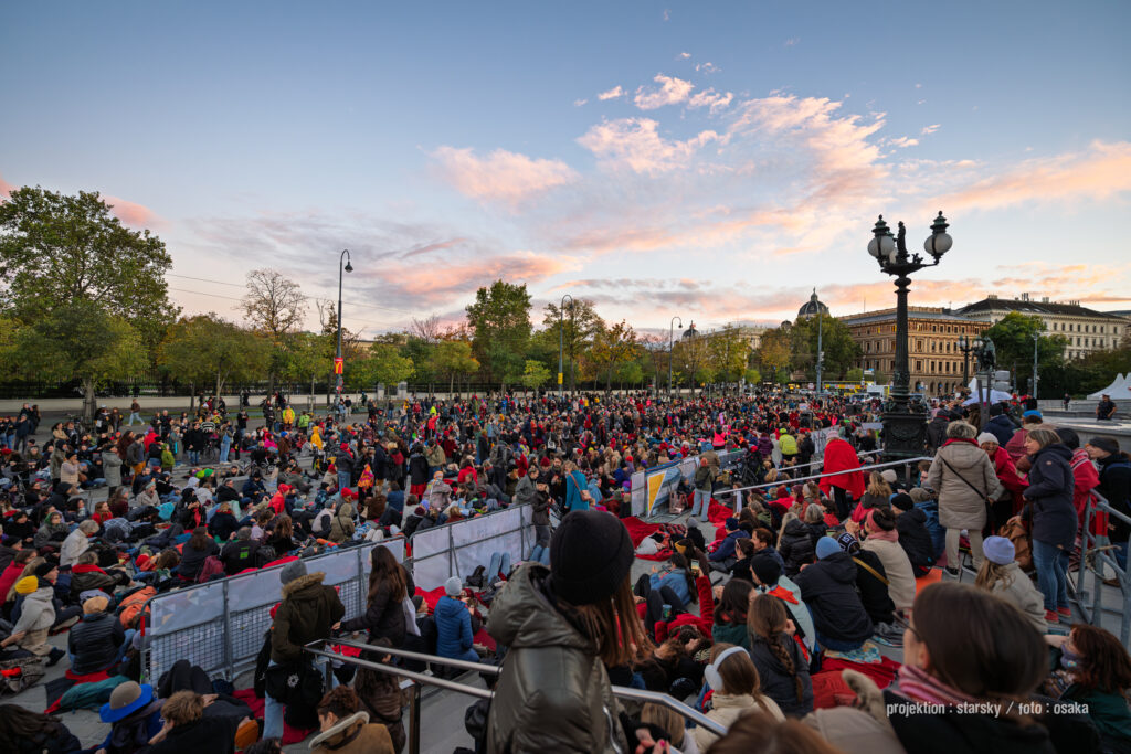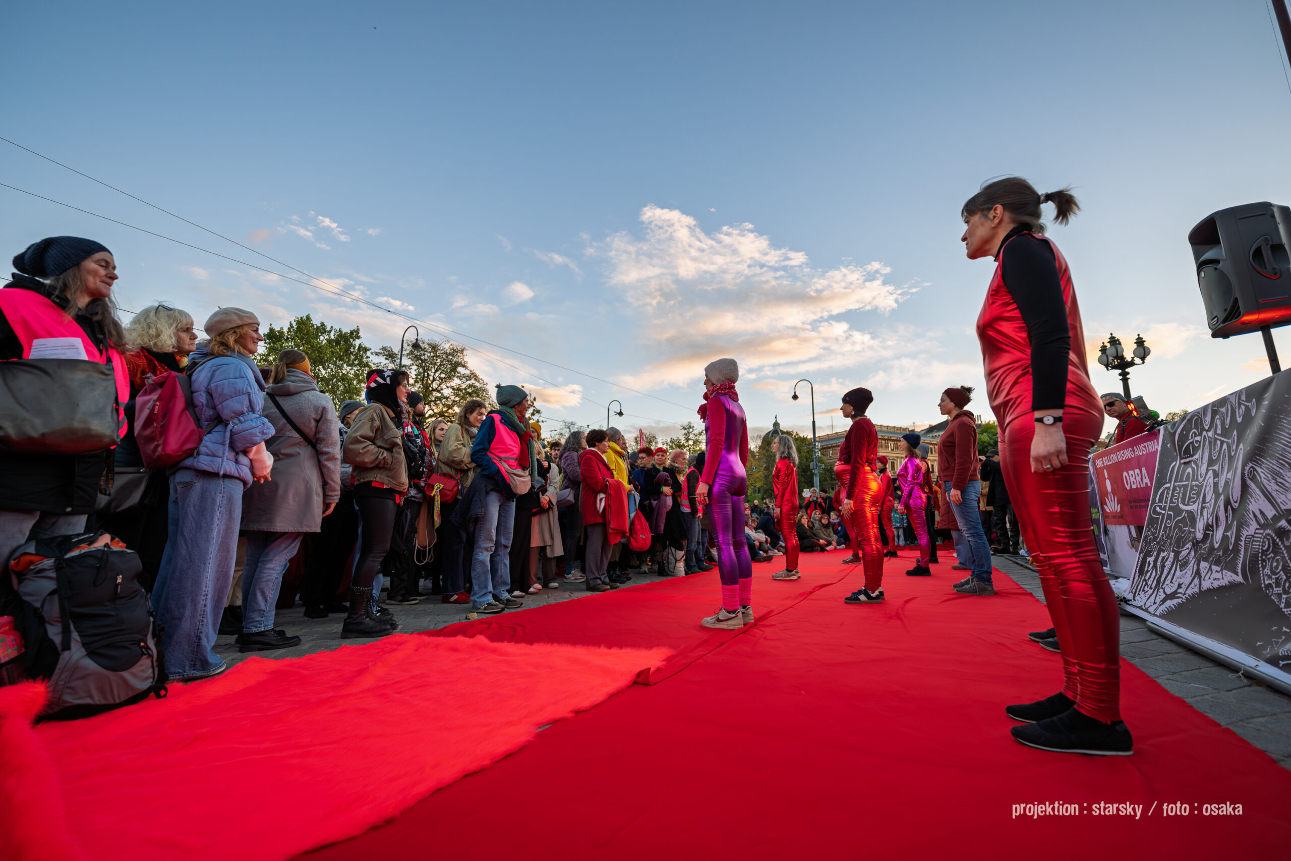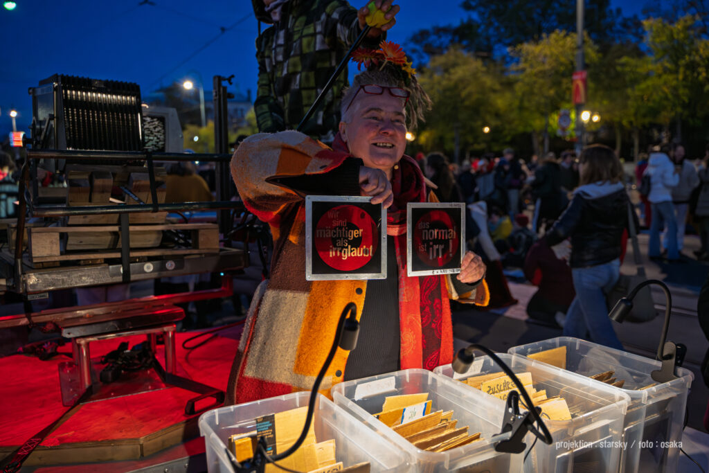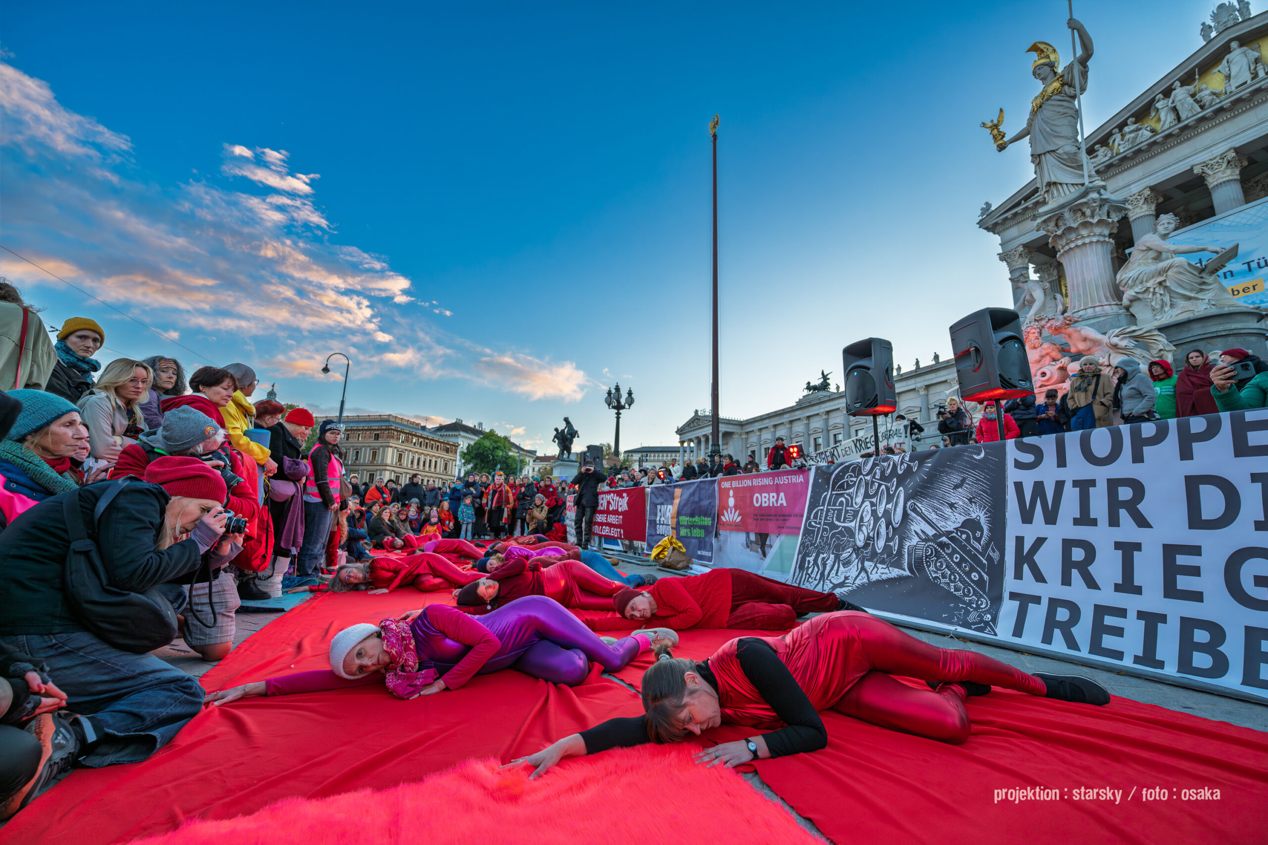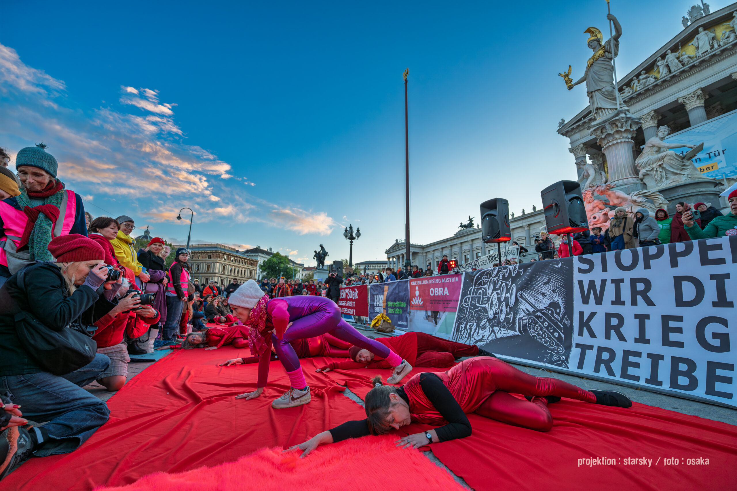 salon emmer gab mit einer Performance der Pionierinnen den Auftakt zu drei gemeinsamen „Stilllegungen“, magischen Momenten des Innehaltens, in denen die gemeinsame Kraft spürbar wurde. Mit im Programm waren mitreißende Songs von ERNST, ein kämpferischer Wordrap von Yasmo und kraftvolle Performances von Aiko Kazuko Kurosaki zu „feminist text interventions“ von starsky – Projektionen, die das Parlament und die Streikenden in zukunftsweisendem Licht erscheinen ließen.